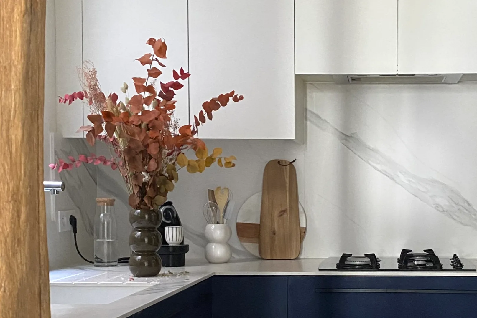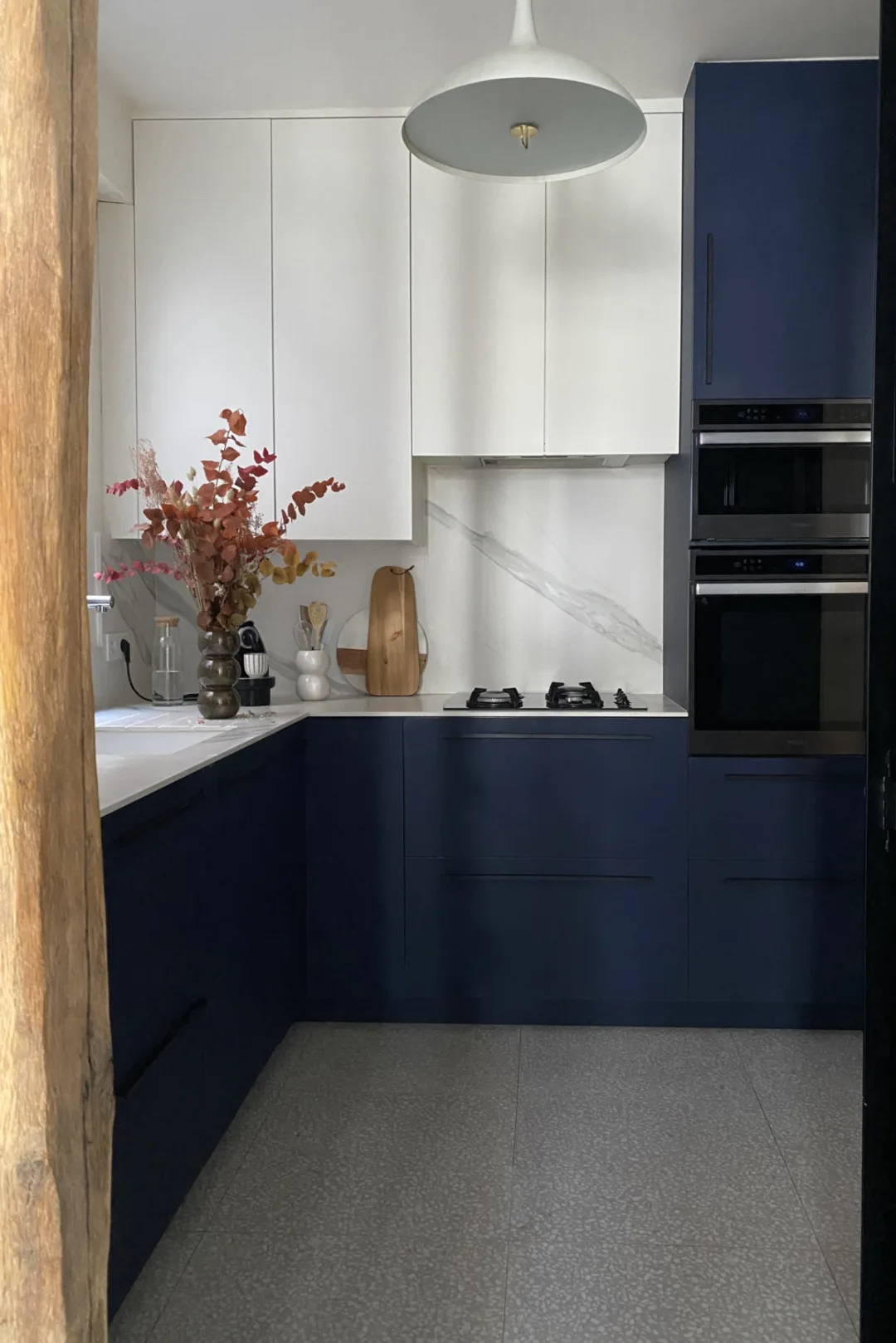 Relativement sombre en raison de son ouverture sur un puits de lumière, la cuisine a gagné en clarté grâce à la création de verrières. Entièrement pensée sur mesure, elle maximise chaque espace de rangement tout en alliant esthétisme et fonctionnalité. Un bleu profond habille les surfaces et met en valeur les poutres apparentes restaurées, tandis que le blanc apporte une touche de luminosité supplémentaire.