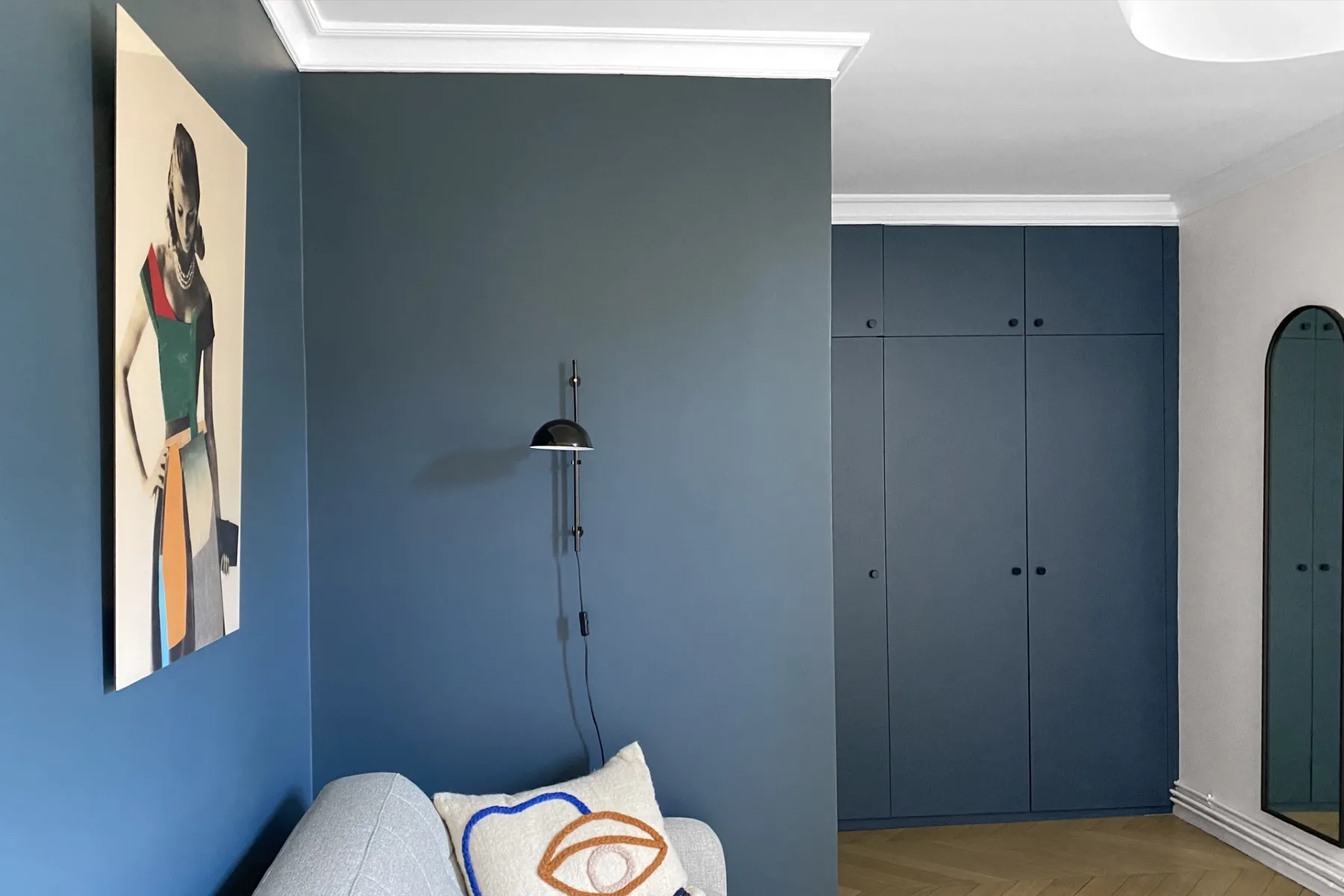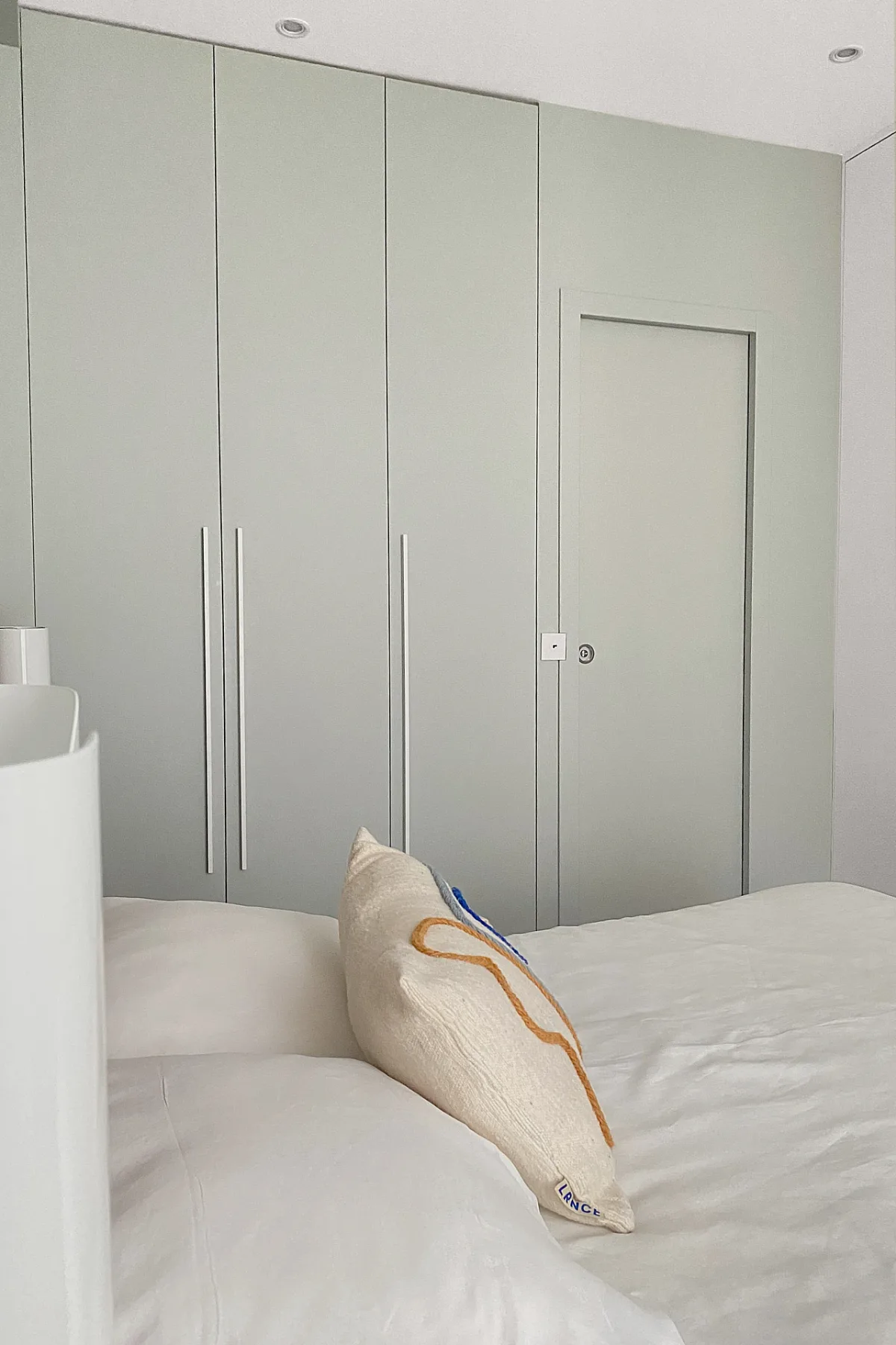 Initialement exposée aux nuisances sonores d’un voisinage mal isolé, la chambre parentale bénéficie désormais d’une isolation totale. Elle offre un maximum de rangements sur mesure et des teintes douces, en harmonie avec le revêtement de la tête de lit, pour inviter au repos.