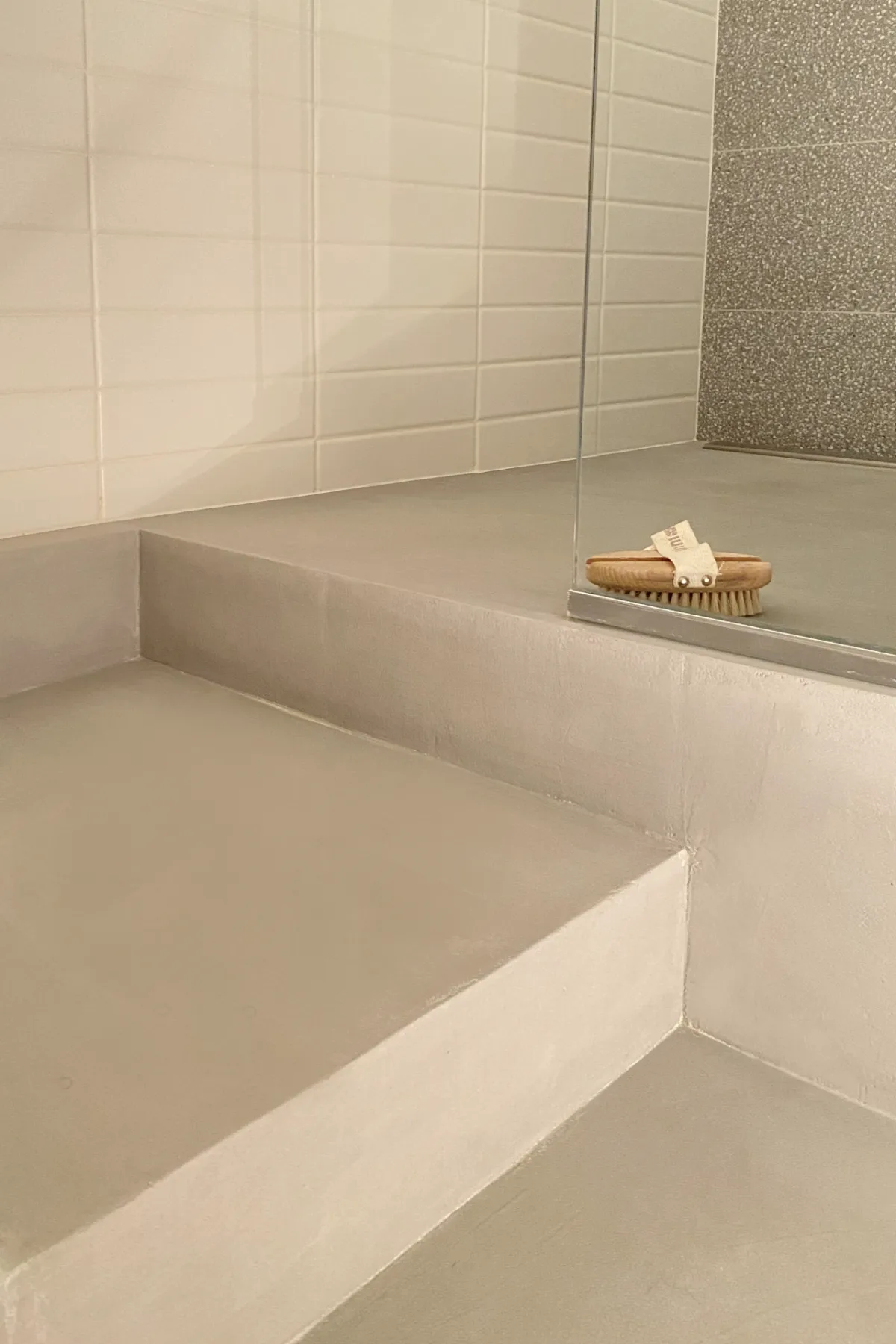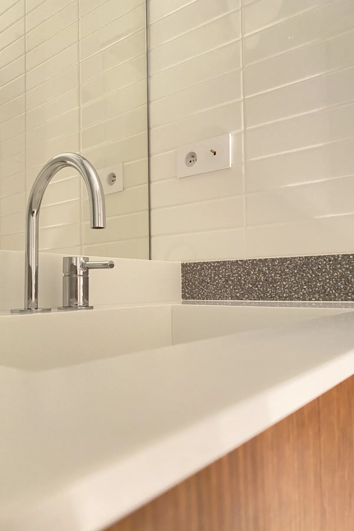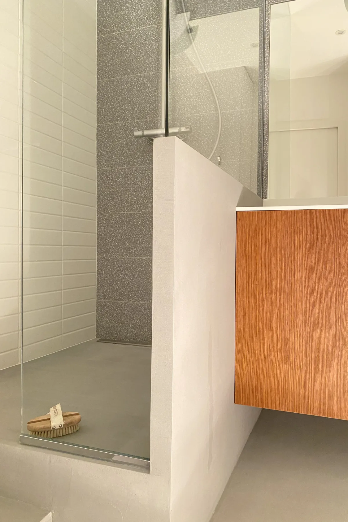 Discrète derrière une porte à galandage, la salle d’eau associe des carreaux de céramique et un sol en béton ciré. Le meuble intègre une vasque en Corian conçue sur mesure, tout comme la paroi de douche, parfaitement ajustée à l’espace.